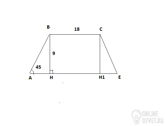 Найдите площадь равнобокой трапеции,если ее меньшее основание равно 18 см,высота 9 см,и острый угол равен 45 градусов