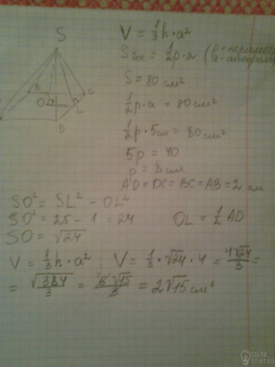 в правильной четырехугольной пирамиде апофема равна 5 см площадь боковой поверхности 80 см в кавадрате . найдите объём пирамиды