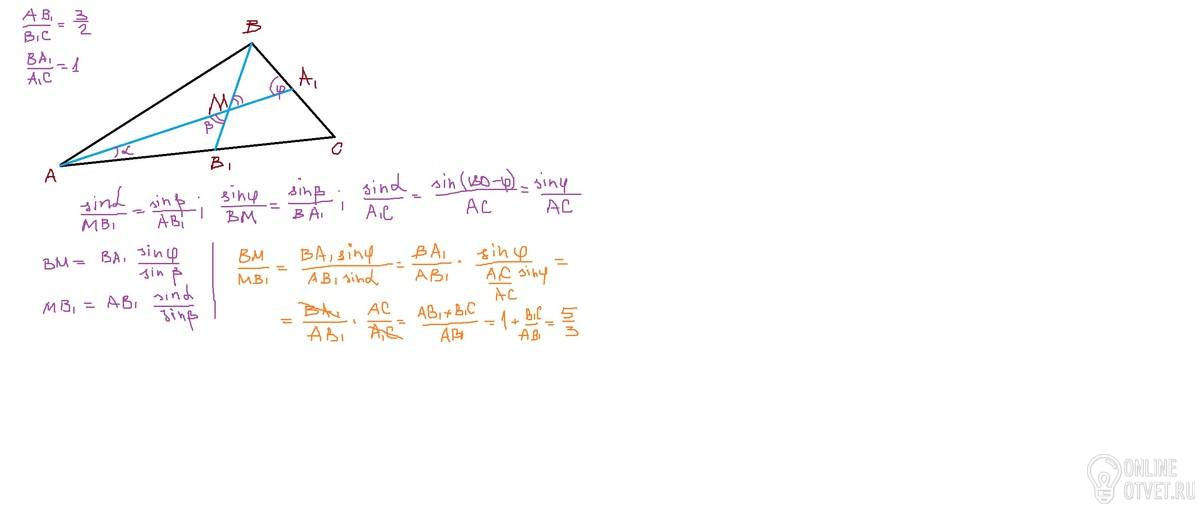В треугольнике АВС точка В1 делит сторону АС в отношении 3:2, считая от точки А, отрезокВВ1 пересекает медиану АА1 в точке М. Найдите отношение ВМ:МВ1