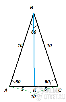 Так как с рисунка видно что ∠А=∠В=∠С=60градусов и АВ=ВС=АС=10, то имеем что треугольник равносторонний. АК = СК = АС/2=10/2 = 5.