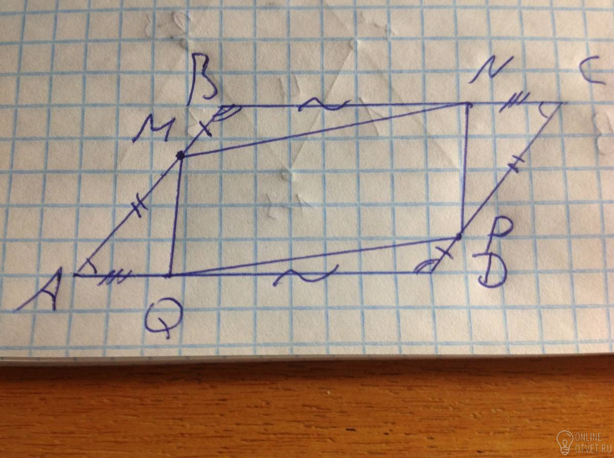 В параллелограмме противоположные углы попарно равны. Рассмотрим треугольники AMQ и CNP. Они равны по 2 сторонам и углу между ними. Тогда MQ=NP. Аналогично, треугольники BMN и OPQ равны по 2 сторонам и углу между ними, тогда MN=PQ. В четырехугольнике MNPQ противоположные стороны попарно равны, тогда этот четырехугольник также является параллелограммом.