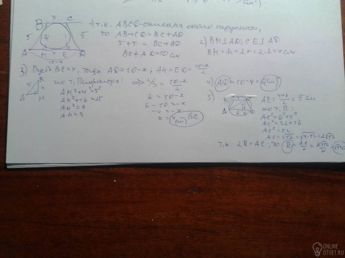 Равнобокая трапеция с боковой стороной 5 м описана около окружности с радиусом 2 м. найти 1)основание трапеции, 2) радиус описанной окружности.