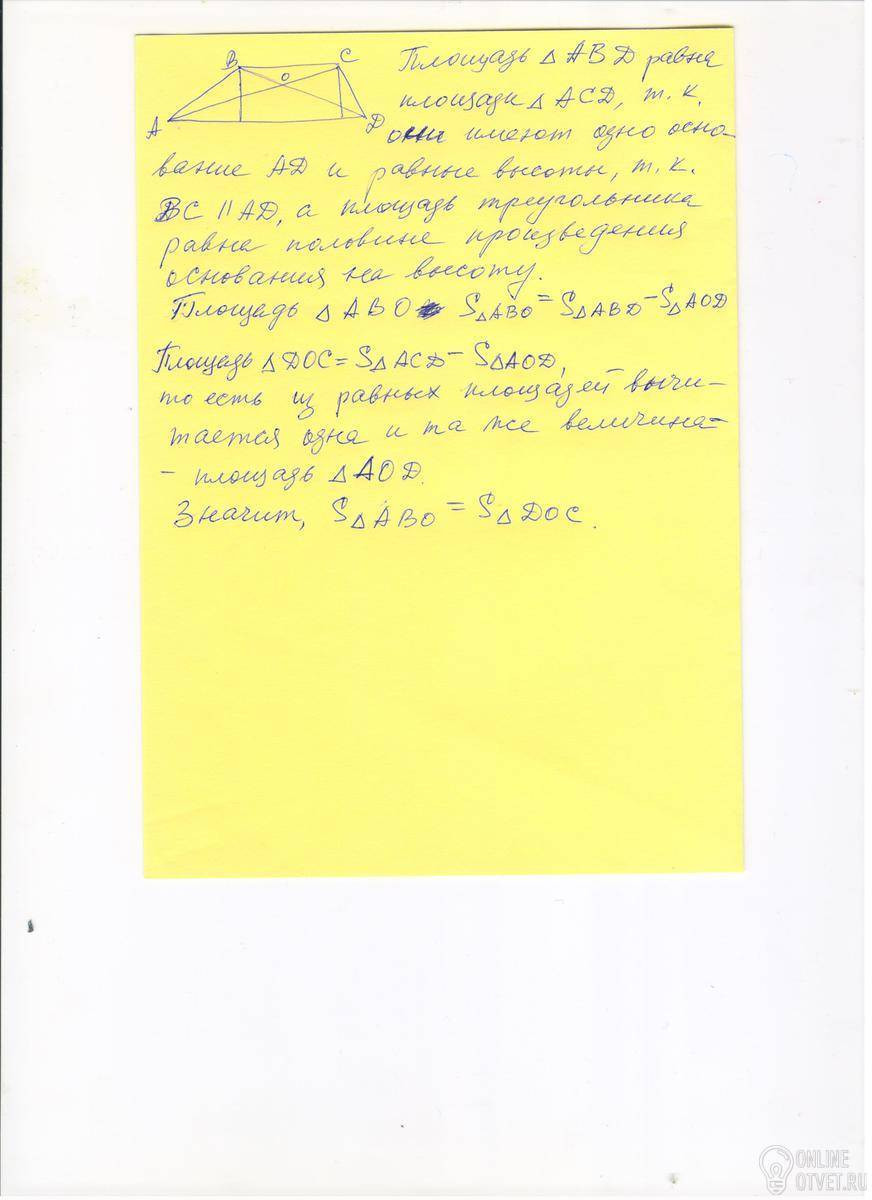 Как доказать , что треугольники ABO и DCO, образованные отрезками диагоналей и боковыми сторонами трапеции, имеют одинаковую площадь.