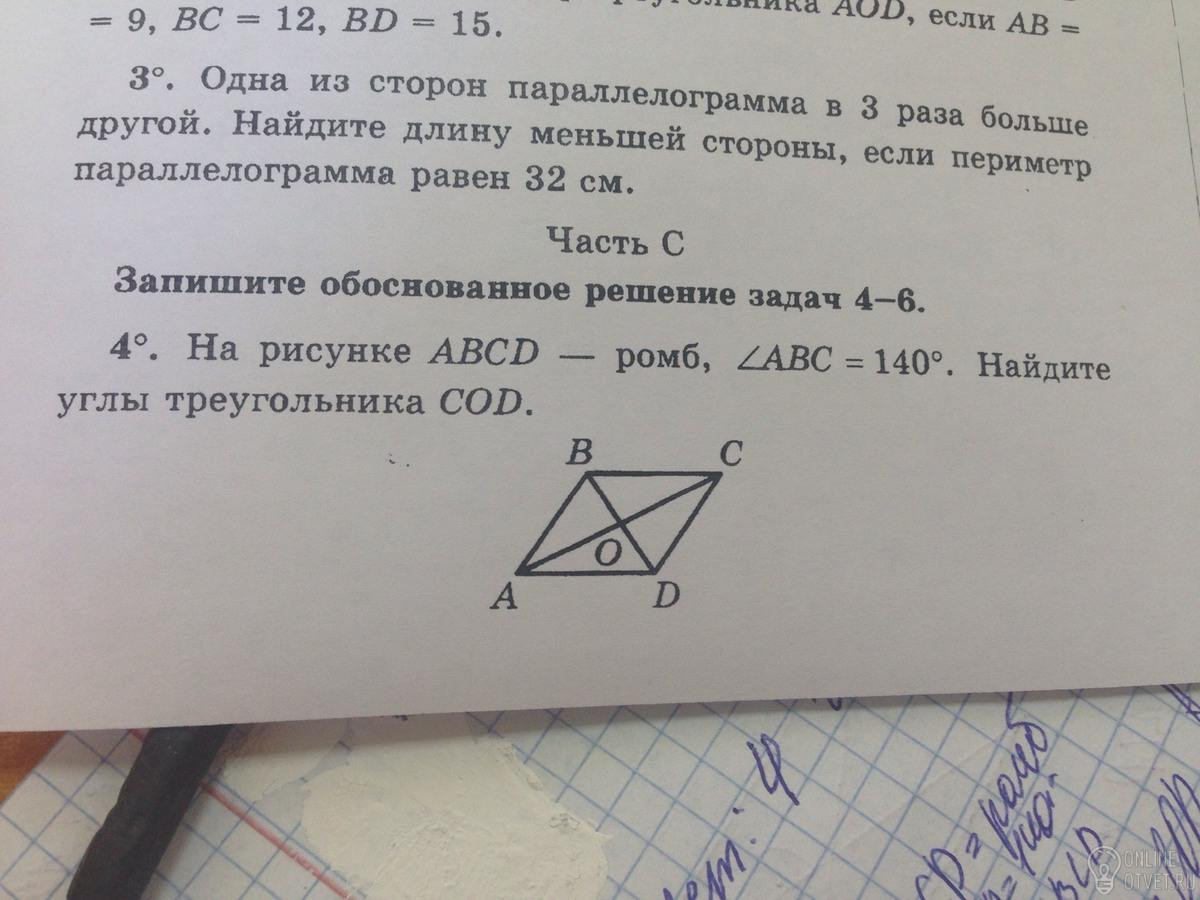 Угол Д= углу В = 140, диагональ делит угол пополам 140 ÷ 2=70, это угол Д в треугольнике СОД, ...угол О 90, найдем угол С из этого треугольника ...С= 180 - ( 90 + 70 )= 20. Ответ углы треугольника СОД 90, 70, 20