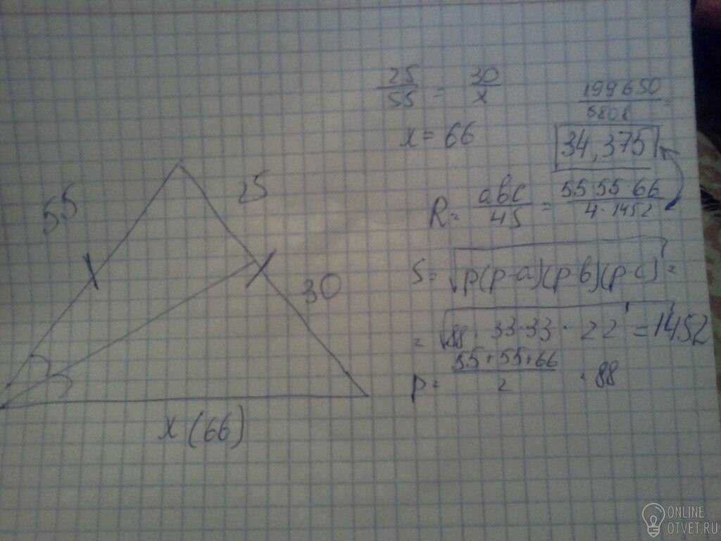 У рівнобедреному трикутнику бісектриса кута при основі ділить бічну сторону на два відрізки 30 см і 25 см, починаючи від вершини при основі. Знайти радіус кола, описаного навколо трикутника