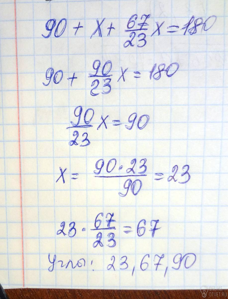 Один острый угол прямоугольного треугольника в 67/23 (дробь) раза больше другого. Найдите больший острый угол. Ответ дайте в градусах.