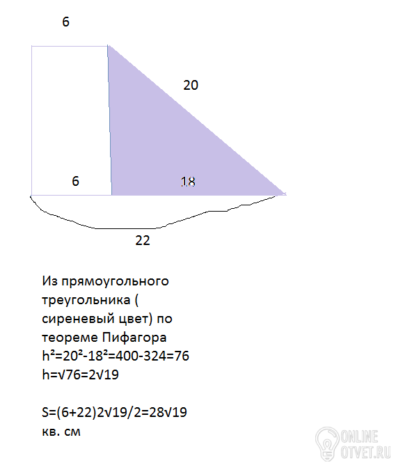 В прямоугольной трапеции основания равны 22см и 6см,болшая боковая сторона-20см.Найдите площадь трапеции.