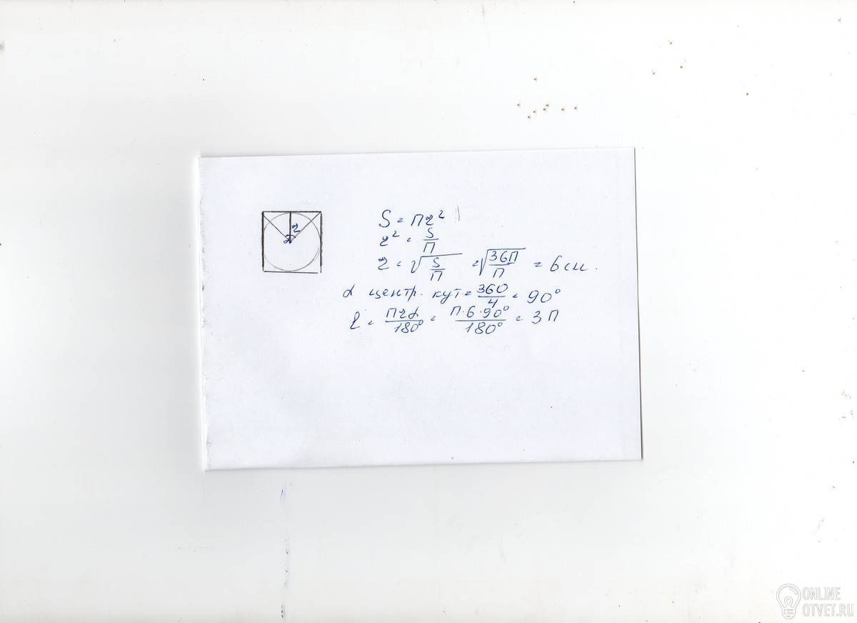 Квадрат вписано в коло. Знайти довжину дуг, на які поділяється коло вершинами квадрата, якщо площа круга, обмеженого цим колом, дорівнює 36см2.