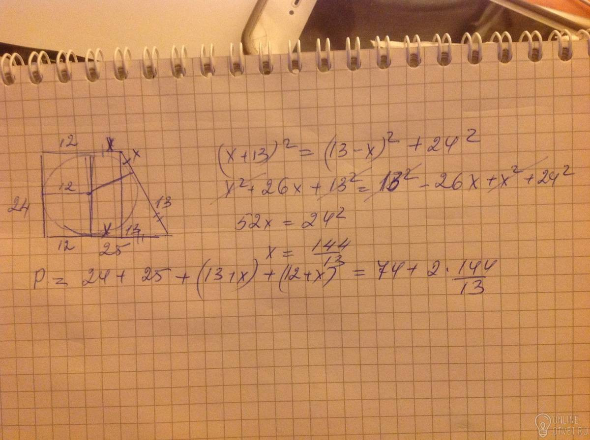 прямоугольную трапецию , равен 12 см, а наибольшая боковая сторона - 25см. Найдите периметр трапеции.