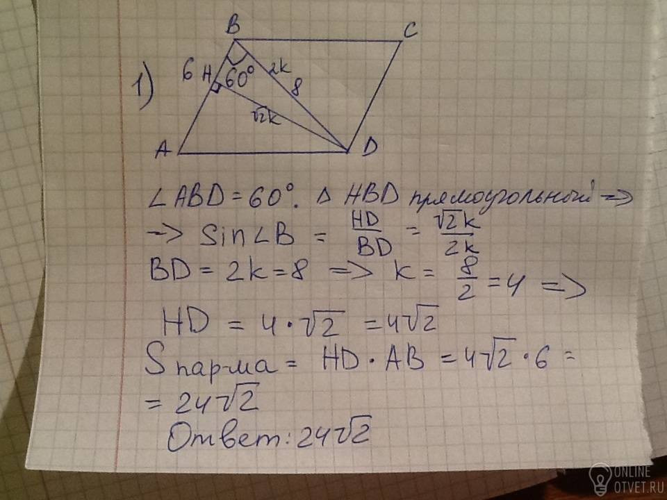 Решите пожалуйста и нарисуйте рисунок: 1.Диагональ BD параллелограмма ABCD равна 8 см и составляет со стороной AB , равной 6 см , угол в 60°.Найдите площадь параллелограмма ABCD.