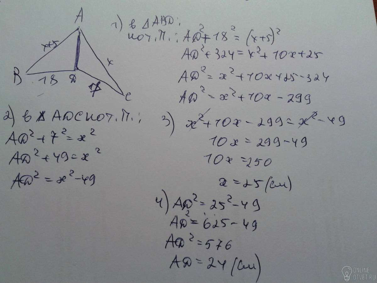 Из точки к плоскости проведены две наклонные. Известно, что разность длин наклонных равна 5 см, а их проекции равны 7 и 18 см. Найдите расстояние от данной точки до плоскости.