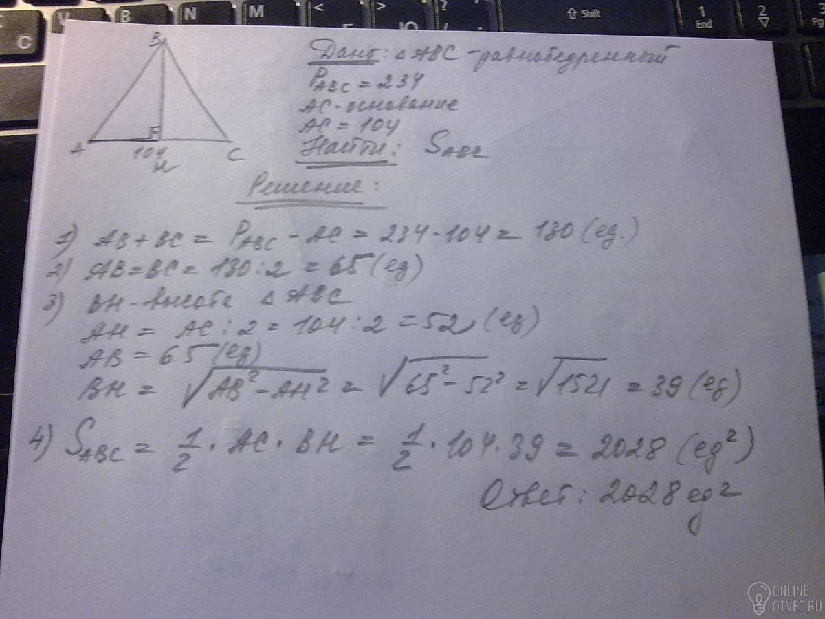Периметр равнобедренного треугольника равен 234, а основание 104. Найдите площадь треугольника