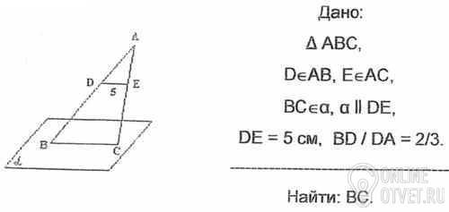На сторонах АВ и АС треугольника АВС взяты соответственно точки D и E так, что ОE = 5 см и ВD = 2/3. Плоскость a проходит через точки B и С и параллельна отрезку ОE. Найдите длину отрезка ВС.