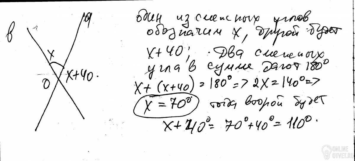 Разность двух углов получившихся при пересечении двух прямых равна 40градусов. Найдите меньший из этих углов. Срочнооооо