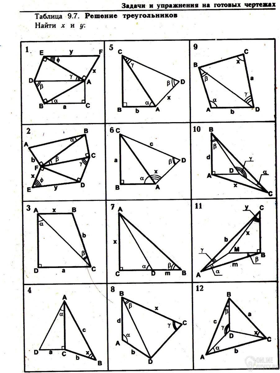 5) АС=b/cos(a) из прямоуг.треуг.АВС, тогда по теореме синусов: x/sin(gamma)=AC/sin(beta), значит x=(b*sin(gamma))/(cos(a)*sin(beta)) 8) По теореме косинусов в треугольнике ABD получим: BD= кореньиз (a^2+b^2-2ab*cos(alpha)). По теореме синусов в треугольнике BCD: x/sin(180-beta-gamma)=BD/sin(gamma), значит x=((кореньиз (a^2+b^2-2ab*cos(alpha))*sin(beta+gamma))/sin(gamma). Надеюсь, вам говорили, что sin(180-beta-gamma)=sin(beta+gamma)
