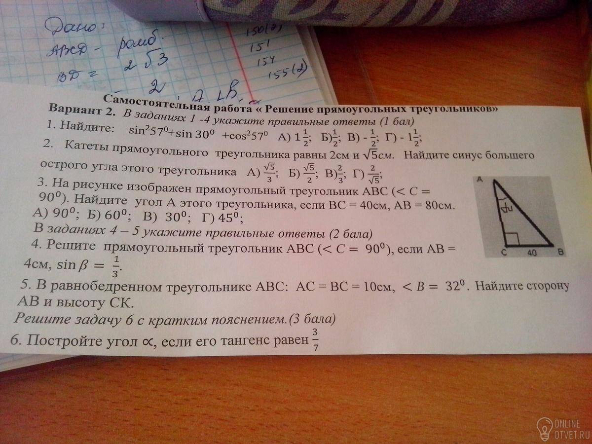 1)1+1/2=3/2=1,5;2) а=v5; в=2, с=3( по теореме Пифагора) напротив большего катета лежит больший угол sin=v5/3;3) sin A=40/80=1/2; A=30 градусов ;4) АС=АВ*sin b=4*1/3=4/3; ВС= корень из (АВ^2-АС ^2=корень из (16-16/9)=4v8/3=8v2/3