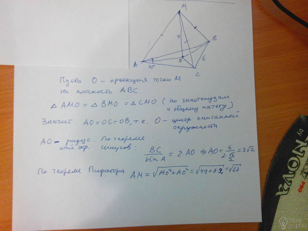 В треугольнике ABC: ВС=6см, угол А= 45°. Точка М равно удалена от вершин этого треугольника . Найдите расстояние , если расстояние от точки М до плоскости АВС равно 7.