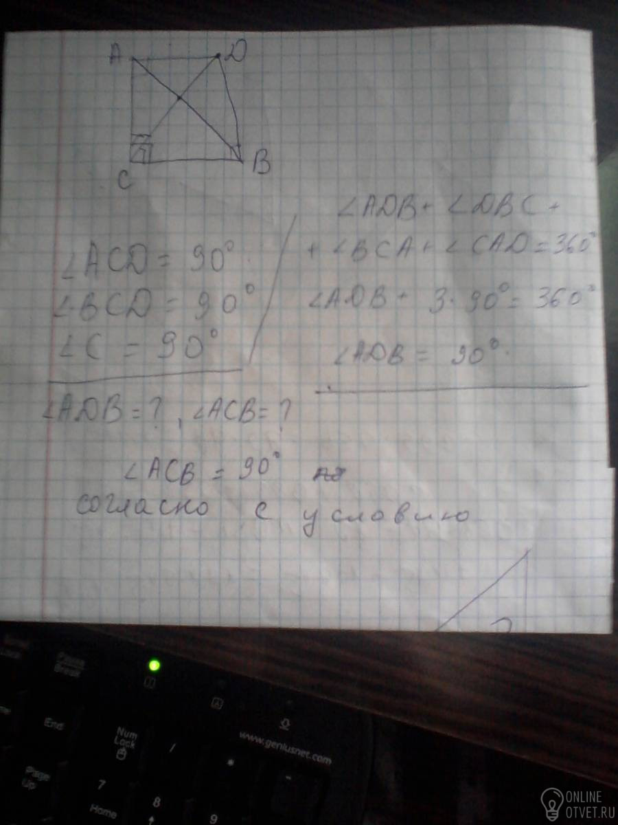 Равнобедренный прямоугольный треугольник ABC (угол С равен 90 ) перегнули по высоте CD таким образом, что плоскости ACD и BCD образовали прямой угол . Найдите углы ADB и ACB/ (c подробным решением и желательно с рисунком)