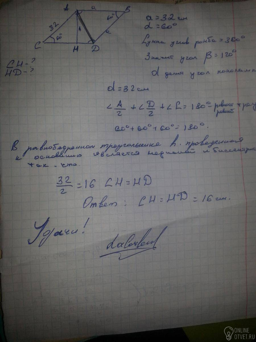 Сторона ромба равна 32 ,а острый угол равен 60 градусов . Высота ромба опущенная из вершины тупого угла, делит сторону на два отрезка. Каковы длины этих отрезков?