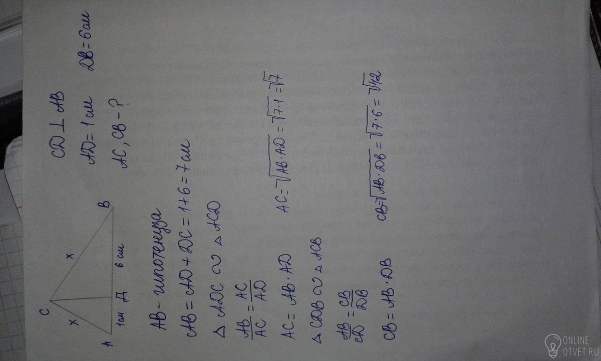 Правильно) иожно проще решить сперва найти высоту СД=v(1*6)=v6 теперь по теореме пифагора катеты найти