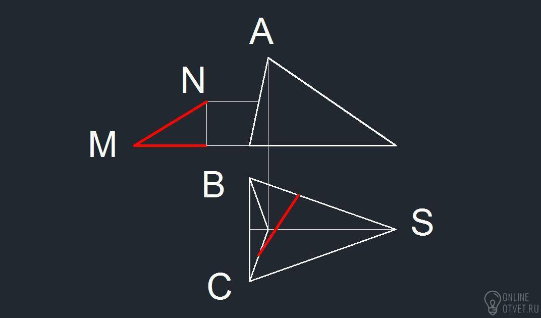 Так как требуется узнать угол между прямой MN и плоскостью BSC, то повернём заданную пирамиду так, чтобы эта плоскость была её основанием.