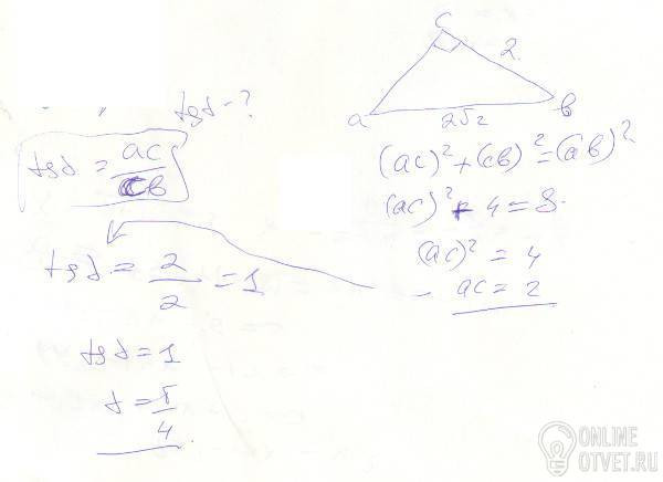В треугольнике abc угол c равен 90, ab=2 корень из 2 ,bc=2