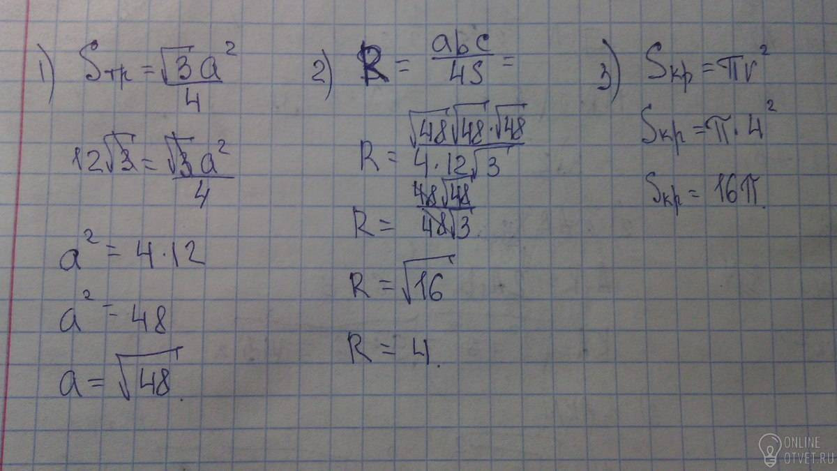 Площадь правильного треугольника равна 12 корней из 3. Найдите площадь круга, описанного около данного треугольника.