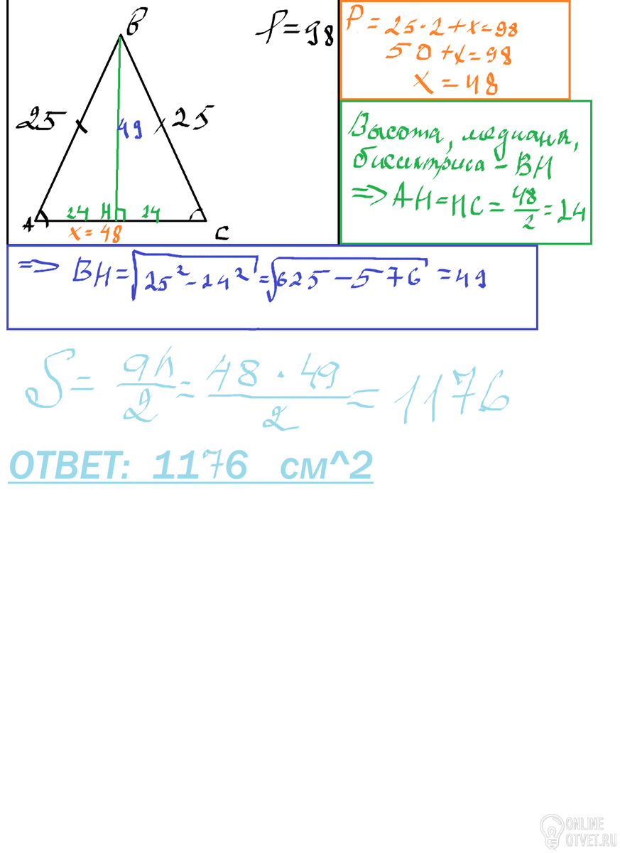 Пеример равнобедренного треугольника равен 98, а боковая сторона равна 25. найдите его площадь