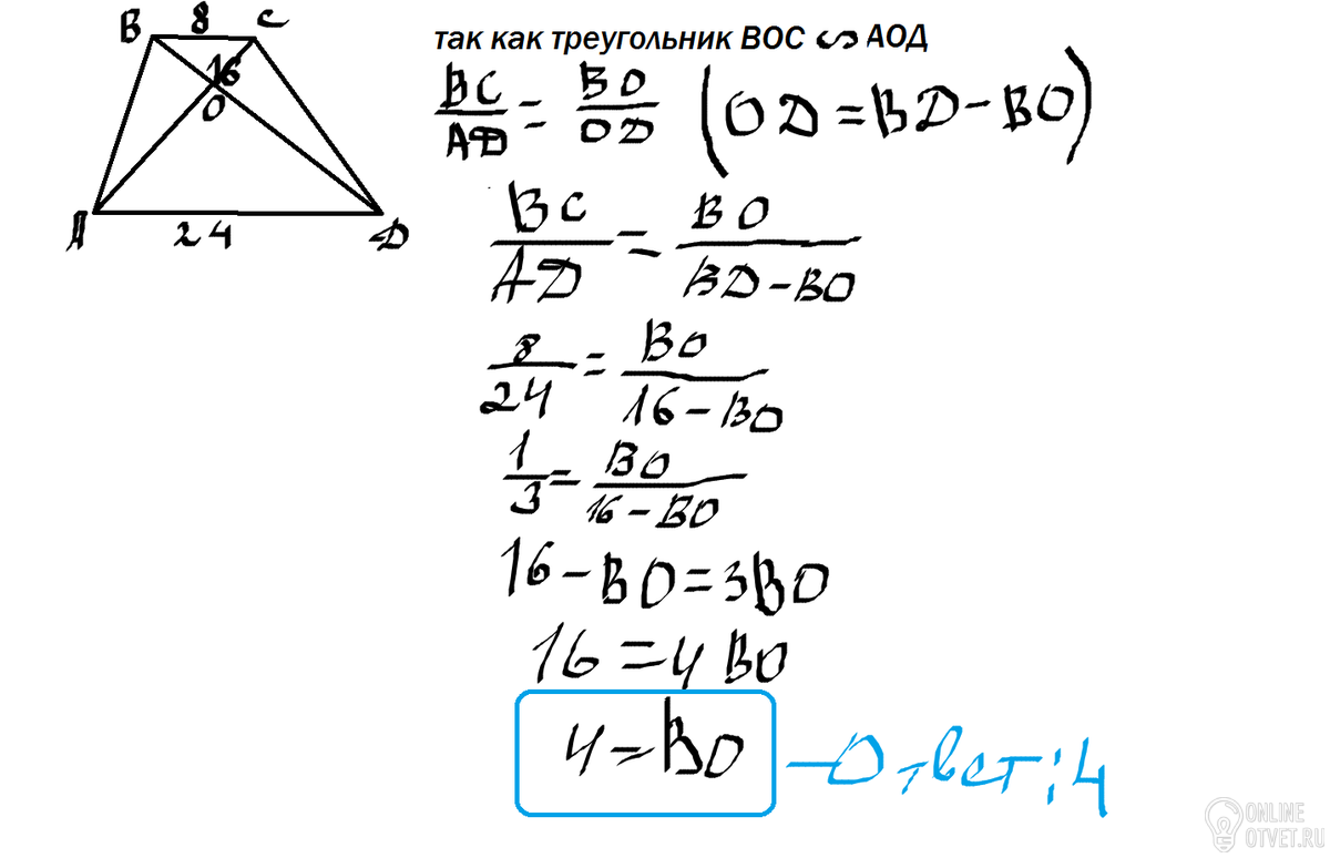 Диагонали трапеции ABCD с основаниями BC и AD пересекаются в точке O. Найдите длину отрезка BO , если BC =8см AD=24см и BD=16 см