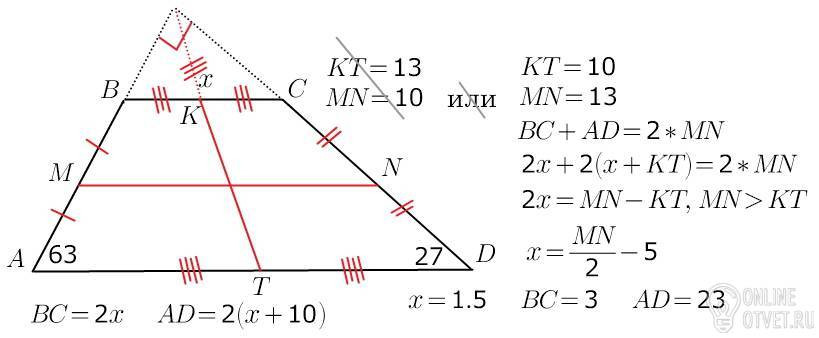 Углы при основании трапеции равны 27° и 63°,а отрезки, соединяющие середины противоположных сторон трапеции, равны 13 и 10. Найдите основания трапеции.