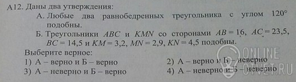 А) Так как в треугольнике не может быть двух тупых углов, то равные острые углы при основании равнобедренного треугольника определятся единственным образом: . Если два (три) угла одного треугольника соответственно равны двум (трем) углам другого треугольника, то такие треугольник подобны - утверждение верно.
