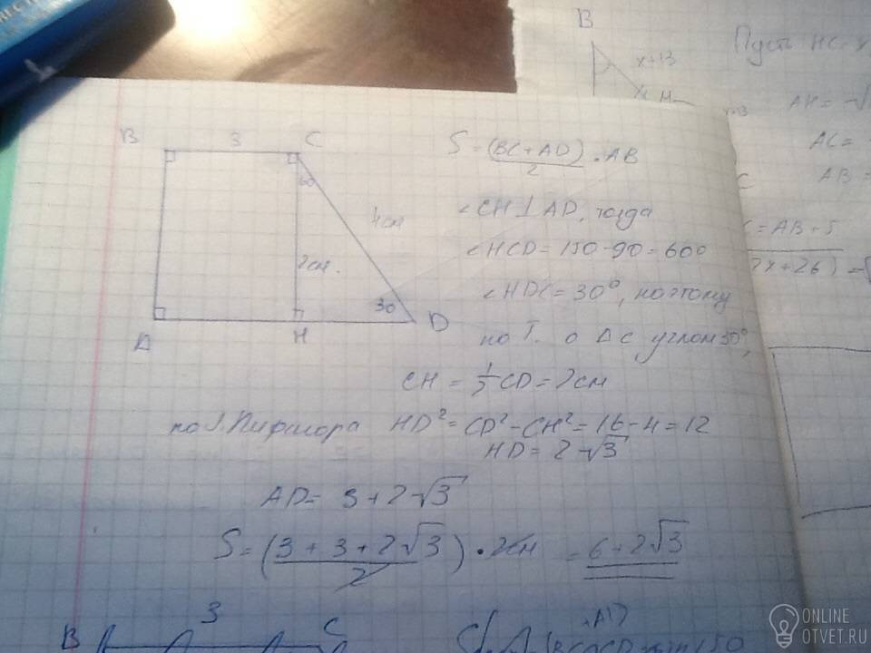 В прямоугольной трапеции меньшее основание равно 3 см, большая боковая сторона 4 см, а один из углов трапеции равен 150 градусов . Найдите площадь трапеции