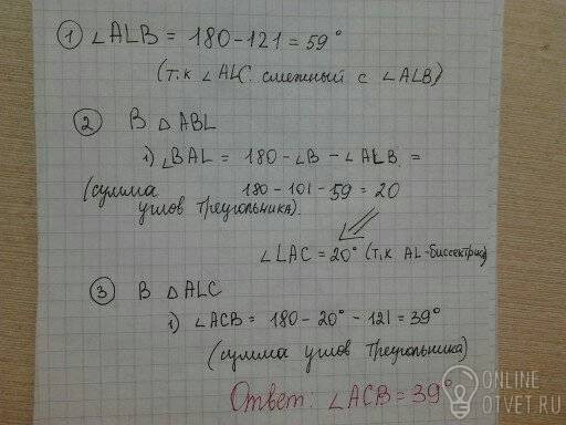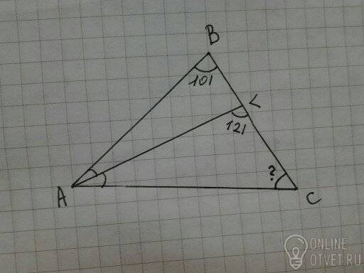 В треугольнике АВС проведена биссектриса AL угол ALC равен 121 градус, угол ABC раыен 101 градус, найдите угол АСВ.