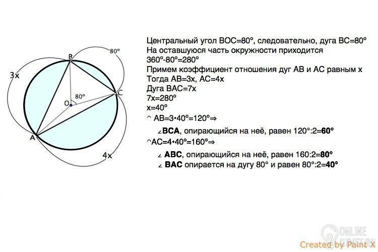 A,B и C лежат на Окр. (О;r),угол BOC =80°,дуга AB относится к дуге АС как 3:4. Найти все углы треугольника АВС.