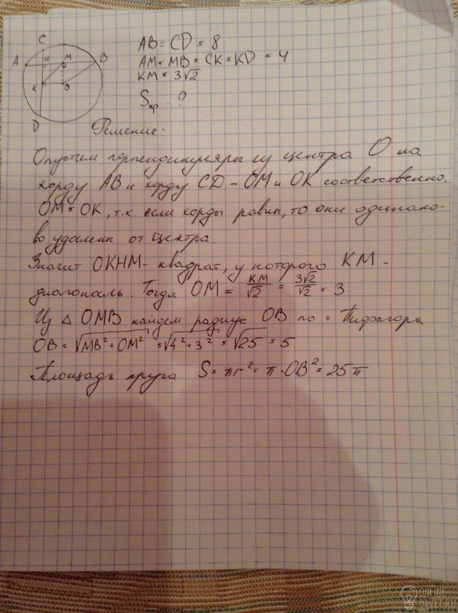 В круге проведены 2 равные перпендикулярные хорды, длины которых равны 8, а расстояния между их центрами равно 3√2. Найдите площадь круга