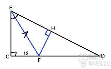В прямоугольном треугольнике DCE с прямым углом C проведена биссектриса EF, причём FC=13 см. Найдите расстояние от точки F до прямой DE