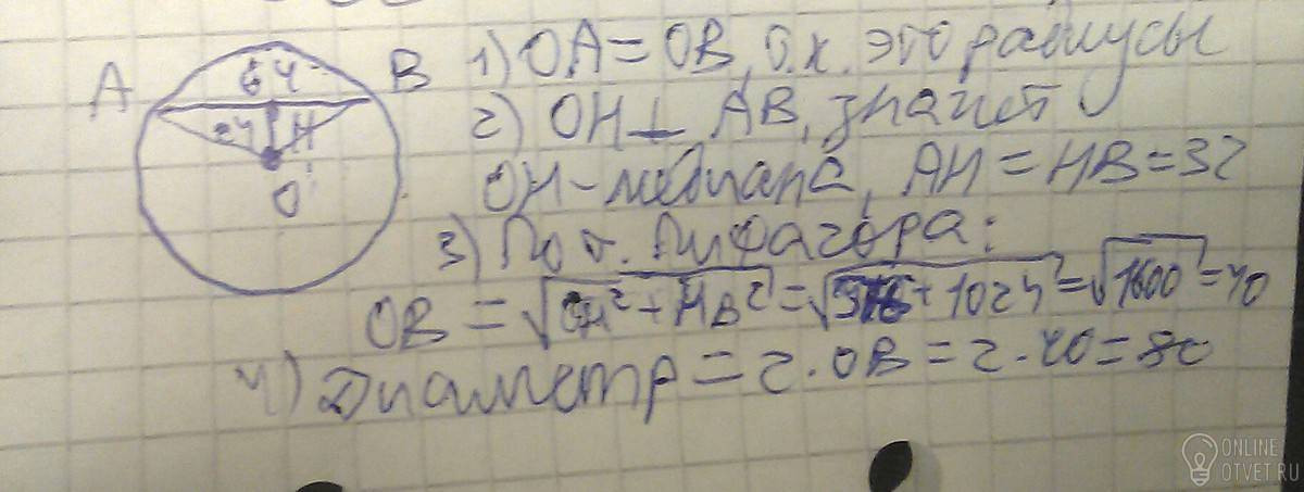 Длина хорды окружности равна 64 , а расстояние от центра окружности до этой хорды равна 24. Найти диаметр окружности.