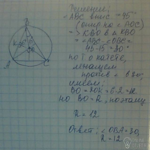 Около остроугольного треугольника ABC описана окружность. Точка О пересечения серединных перпендикуляров удалена от прямой АВ на 6 см. Найдите угол АОС = 90 градусов., угол ОВС = 15 градусом.