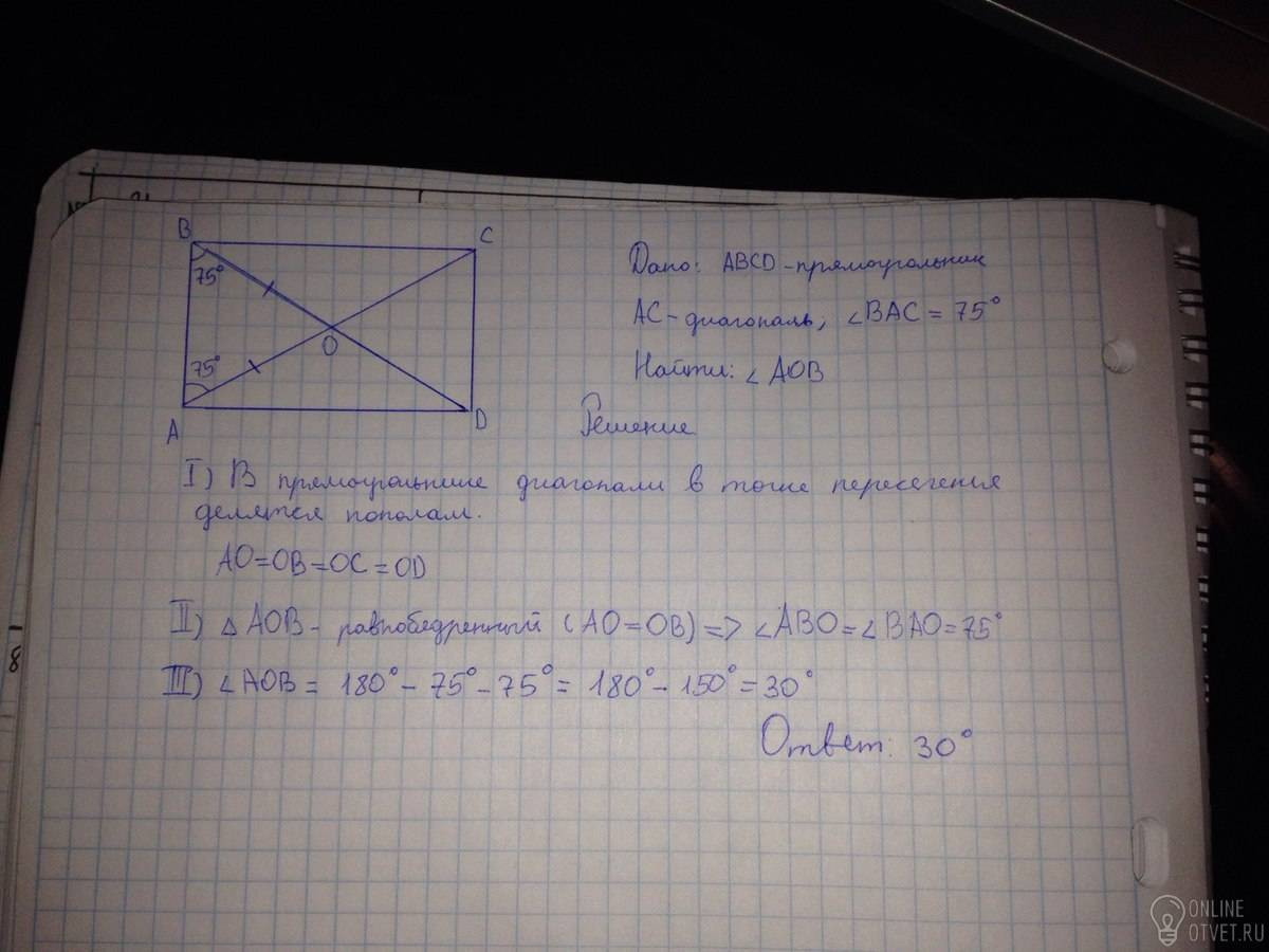Диагональ прямоугольника образует угол 75 градусов с одной из его сторон.найдите угол между диагоналями этого прямоугольника.ответ дайте в градусах