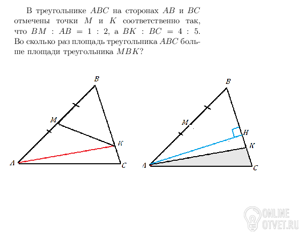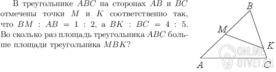 В треугольнике АВС на сторонах АВ и ВС отмечены точки М и К соответственно так, что ВМ:АВ=1:2, а ВК:ВС=4:5. Во сколько раз площадь треугольника АВС больше площади треугольника МВК?