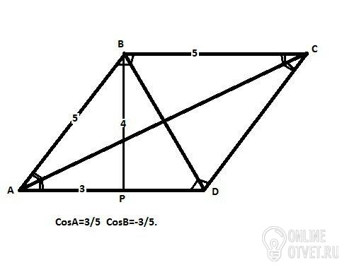 Опустим высоту из тупого угла В на сторону АD. получили Пифагоров треугольник, в котором гипотенуза (сторона ромба) равна 5, катет (высота ромба) равна 4, значит второй катет равен 3. Тогда косинус угла А ромба равен 3/5.