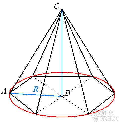 Боковое ребро правильной шестиугольной пирамиды равно 14 см и наклонено под 30 градусов к основанию. Вычислите площадь круга описанного около шестиугольника.