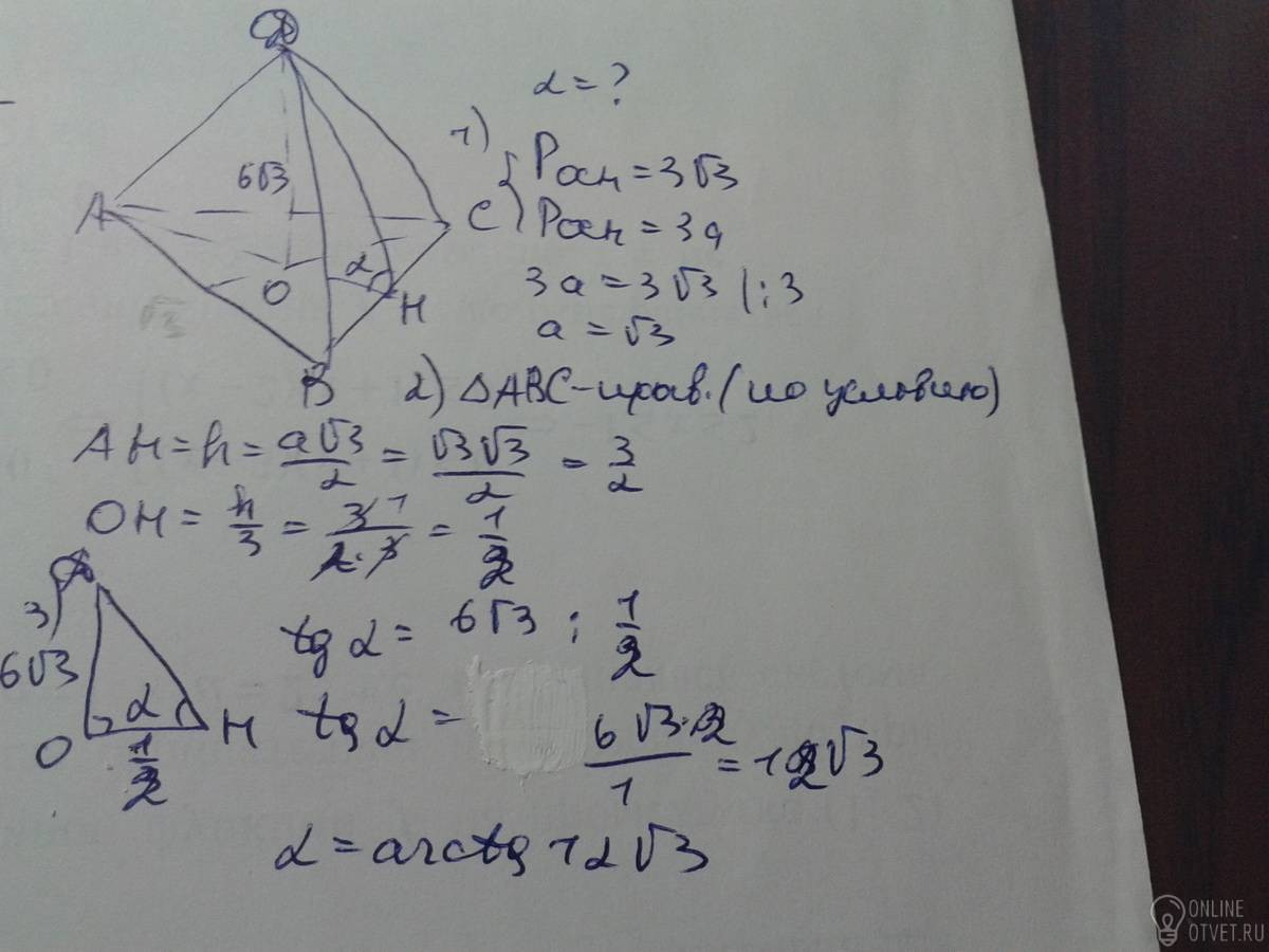 Найдите величину двугранного угла при ребре основания правильной пирамиды DABC с периметром основания 36корень из 3 и высотой 6корень из 3
