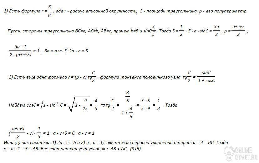 В треугольнике АВС синус угла С равен 3/5, АС = 5, ВС = 4. Найдите радиус вписанной в этот треугольник окружности, если АВ<АС.