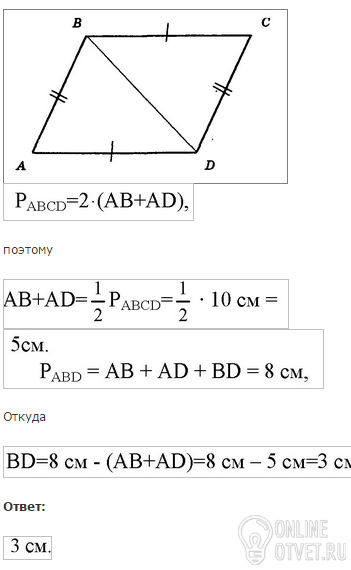 Периметр параллелограмма АВСD равен 10 см а периметр треугольника АВD 8см .Какова длинга диагогали BD
