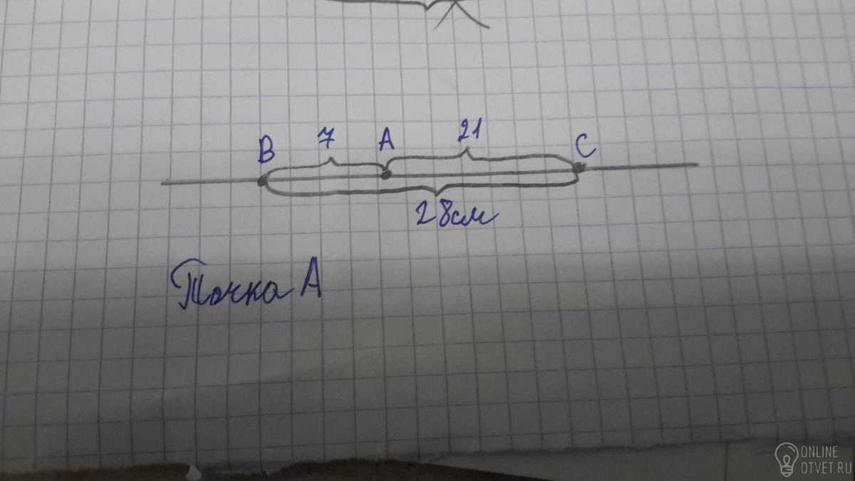 На прямой отмечены точки A,B,C так,что AB=7 см.AC=21м.BC=28см.Какая из этих точек лежит между двумя другими?
