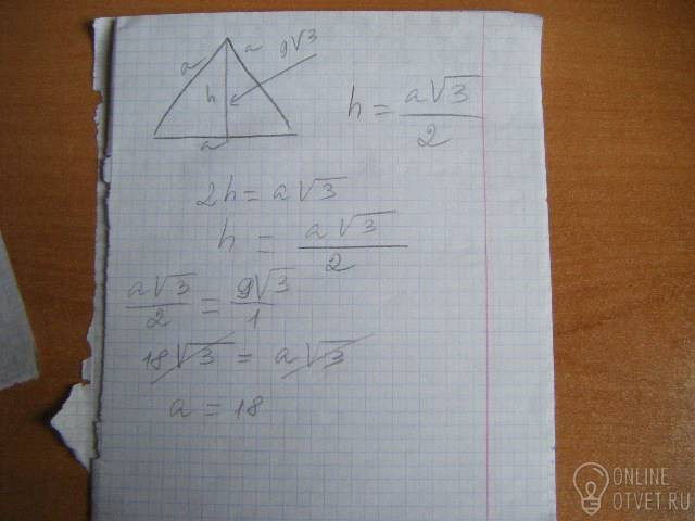 Медиана равностороннего треугольника равна 9 корней из 3. Найдите его сторону