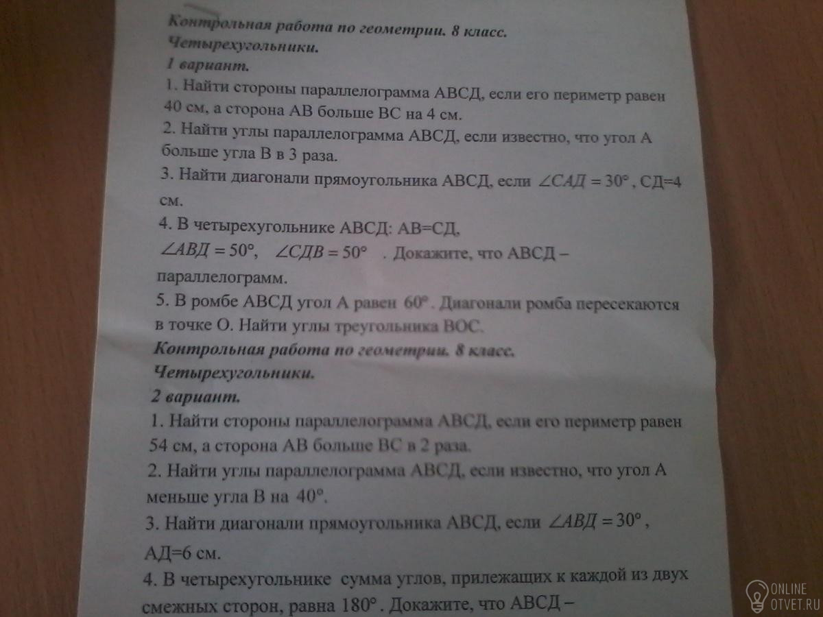 1задние:С D=ВС-х, AD=АВ-х+4 ;2х+2х+8=40; 4х=32 ;х=32:4=8-это СD иВС;8+4=12-это AD AB;;;;2задание:<В=
