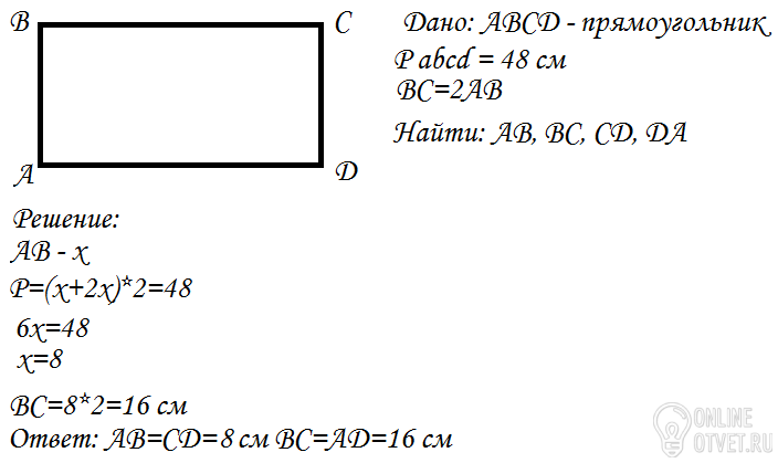 Периметр прямоугольника 48см одна из его сторон в 2 раза больше другой найдите длины сторон прямоугольника