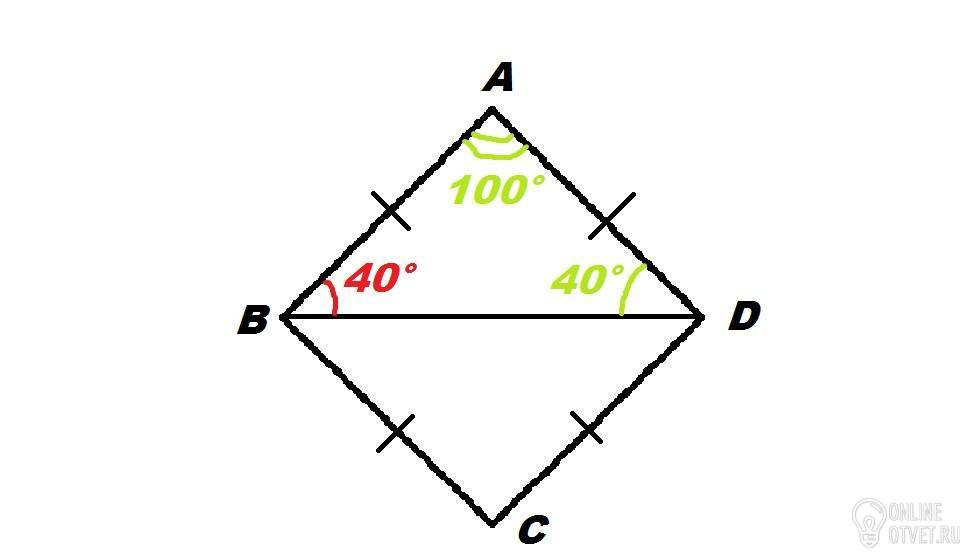 В ромбе ABCD, диагональ BD образует со стороны AB угол в 40градусов. Найти углы ромба.Главное оформление и решение .Отдаю 34 балла